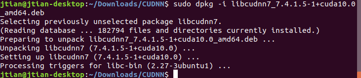 sudo dpkg -i libcudnn7_7.4.1.5-1+cuda10.0_amd64.deb