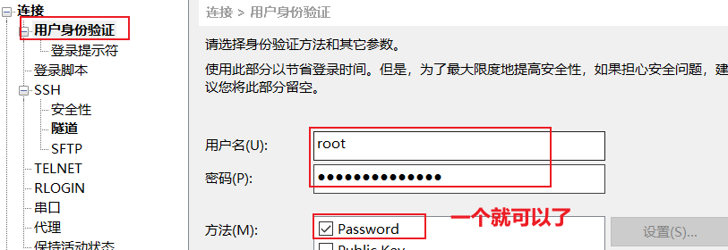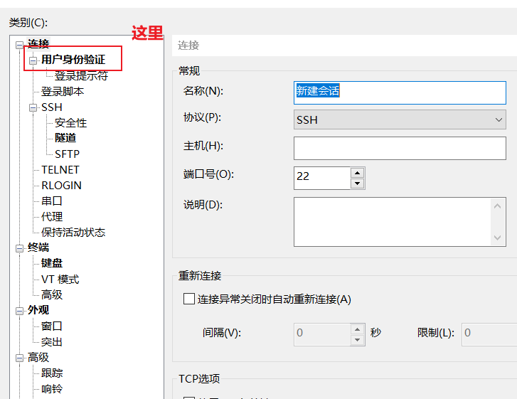 接着,点击xshell会话菜单栏的用户身份验证,填入相关信息