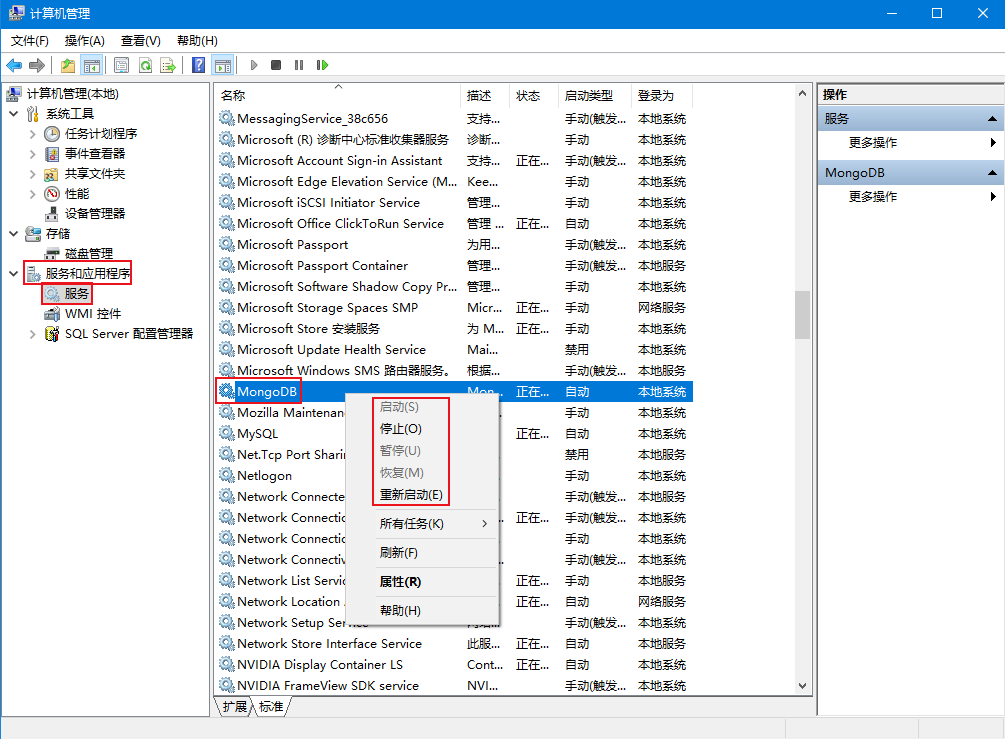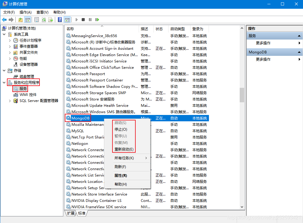 我的电脑 - 管理 - 服务和应用程序 - 服务 - MongoDB