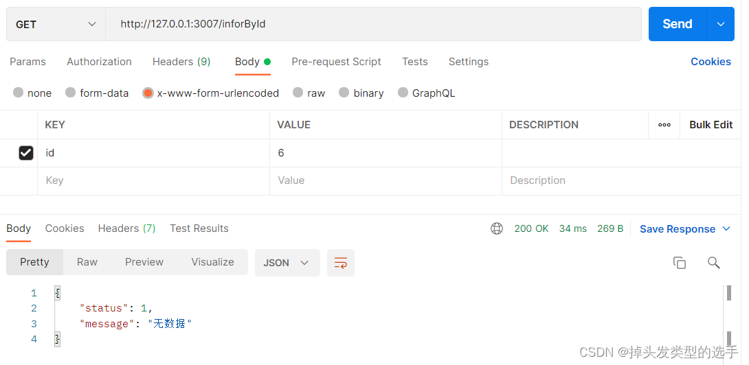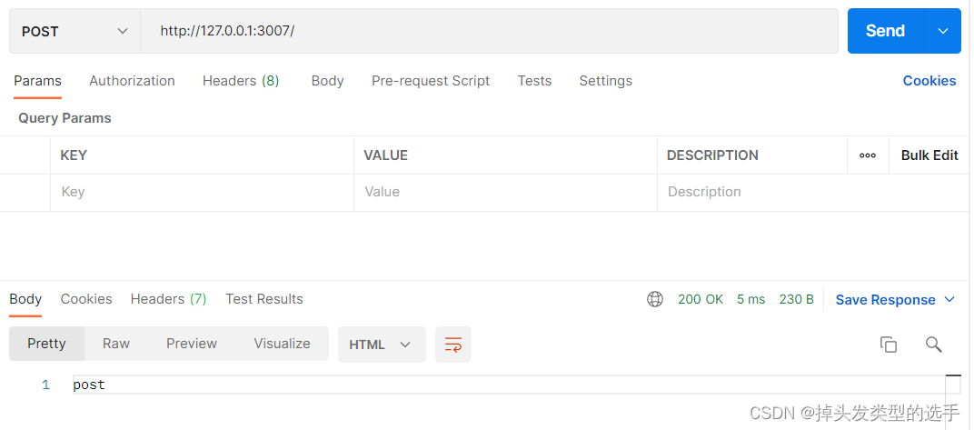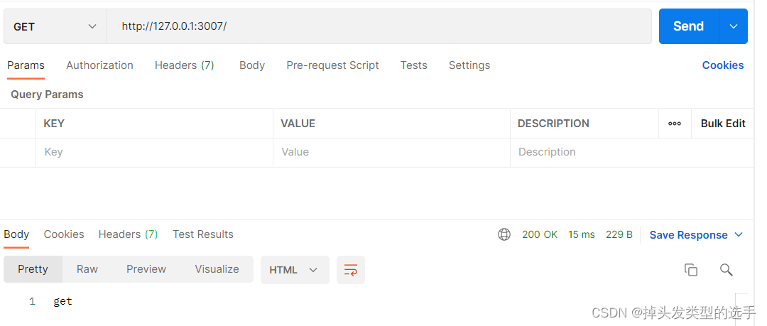 然后测试一下,接口测试的话可以使用一个软件Postman。可以选择get或post请求,后面写路由,也有写参数,请求头的地方。下面的图和上面的路由是对应的。