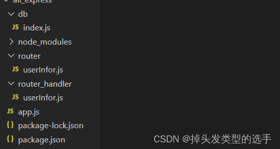 module.exports = router这个文件需要引入express来创建路由,并将路由的处理函数部分再分离出去,导入处理函数的文件,根据函数名匹配路由的处理函数。最后需要将路由对象暴露出去,在app.js文件中使用。