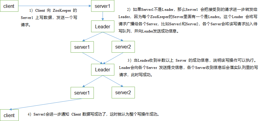 2、如果 Server1 不是 Leader,那么 Server1 会把收到的请求转发给 Leader,Leader 将这个请求广播给所有 Follwer,Follwer 如果同意的话会将该请求加入到代写队列,并向 Leader 发送成功信息