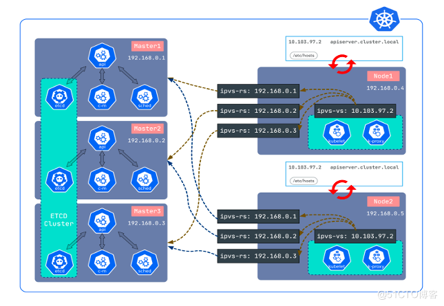 sealer 的集群高可用使用了轻量级的负载均衡 lvscare。相比其它负载均衡,lvscare 非常小仅有几百行代码,而且 lvscare 只做 ipvs 规则的守护,本身不做负载,非常稳定。直接在 node 上监听 apiserver,如果失效就移除对应的规则,重新运行之后会自动加回,相当于是一个专用的负载均衡器。