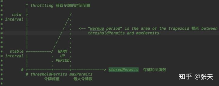 * 每秒增加的令牌数为 warmup时间/maxPermits. 这样的话,在warmuptime时间内,就就增张的令牌数量