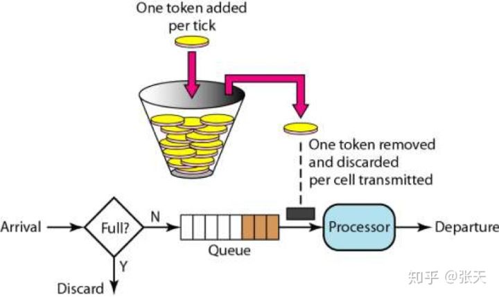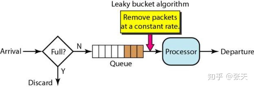 漏桶算法的实现往往依赖于队列,请求到达如果队列未满则直接放入队列,然后有一个处理器按照固定频率从队列头取出请求进行处理。如果请求量大,则会导致队列满,那么新来的请求就会被抛弃。