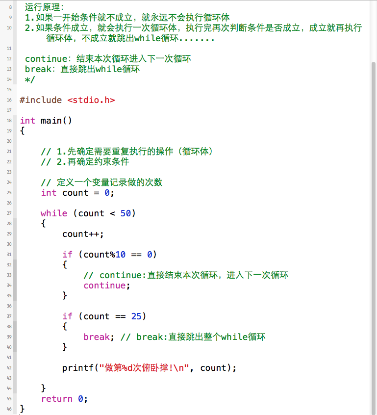 解释:count % 10 == 0时,即count为10的整数倍时,就会执行continue(结束本次循环,不再输入,而直接进入下次循环)