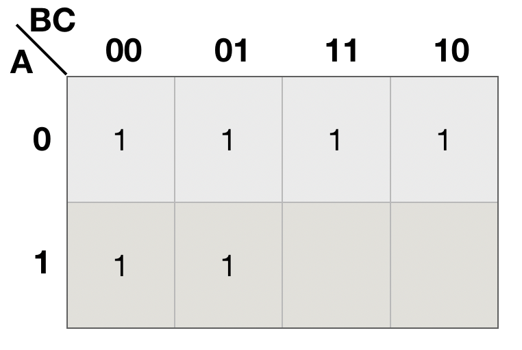 性质3:卡诺图中八个逻辑相邻的1方格可以合并成一个与项,并消去三个变量。