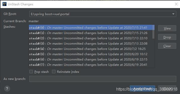 幸亏IDEA右下角提供了提醒,以及unstash changes工具。该工具利用了git的功能,将未提交的本地更改存储起来,还是很好用的