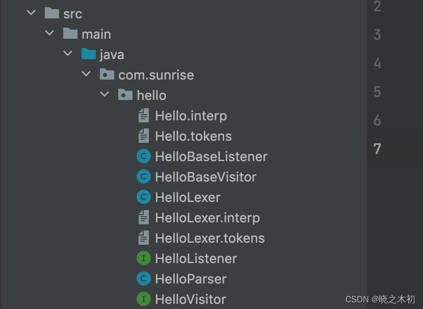 Hello.g4中,添加通过@header指定package@header{ package com.sunrise.hello; } - 修改