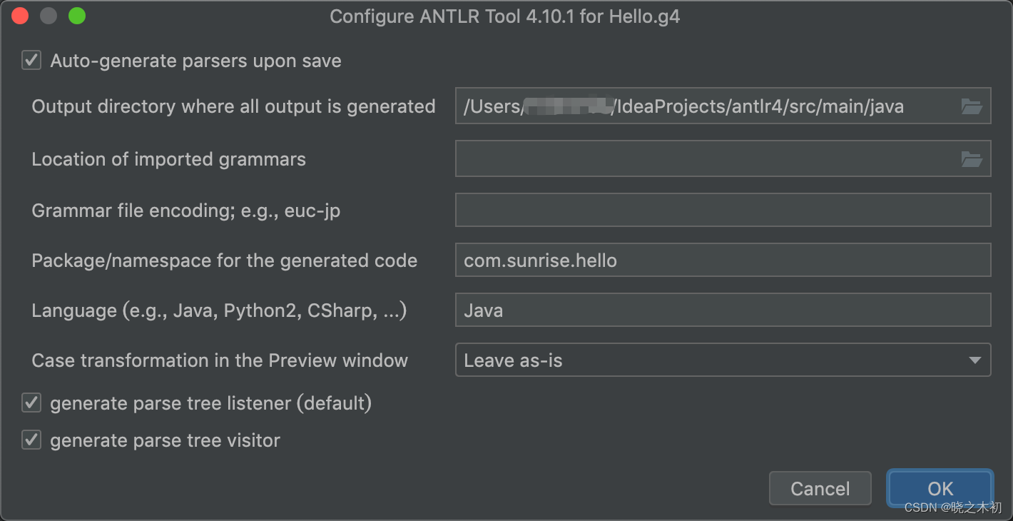 antlr4 Hello.g4 -package com.sunrise.hello -visitor -o ../java/com/sunrise/hello -Dlanguage=Java-package,指定包名;-visitor,表示生成visitor代码,默认是不生成的;-o,指定Java代码的输出目录;-Dlanguage,指定代码语言,具体有哪些option可以查看官网