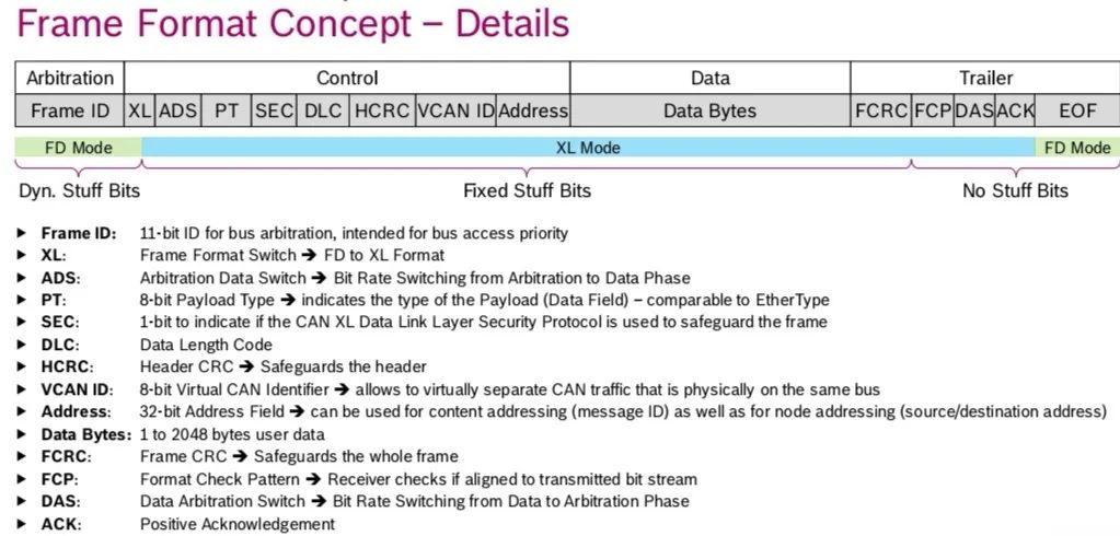 CAN XL提供一个最大2048字节的数据字段(例如IP(Internet协议),甚至可以传输完整的以太网帧)。11位优先级字段可由网络层用于寻址和指示数据字段的内容。此外,CAN XL协议为使用的下一个更高协议提供8位指示符,其嵌入式层设置参数对于其他高层协议也很有帮助,以简化多协议堆栈。 CAN XL帧通过两个CRC(循环冗余校验)进行保护,其Hamming距离为6,这意味着可以检测到五个随机分布的比特错误。