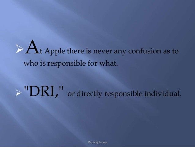 苹果公司公司发明了这样一个管理概念:直接责任人(Directly Responsible Individual,简称DRI)。DRI遍布于公司各个层级。在苹果,谁负责什么,永远不会搞混。DRI的名字经常出现在会议进程表上,每个人都知道谁是直接负责人。如此公开透明的责任制使得每一个员工没有互相推诿和偷懒的机会,一旦项目出现问题,很容易找到出现问题的环节予以纠正,并追究相关责任。而且,一个项目只能有一个DRI,如果超过一个DRI,那就等于没有直接责任人。DRI能够有效加速决策流程,也可以减少很多不必要的会议。