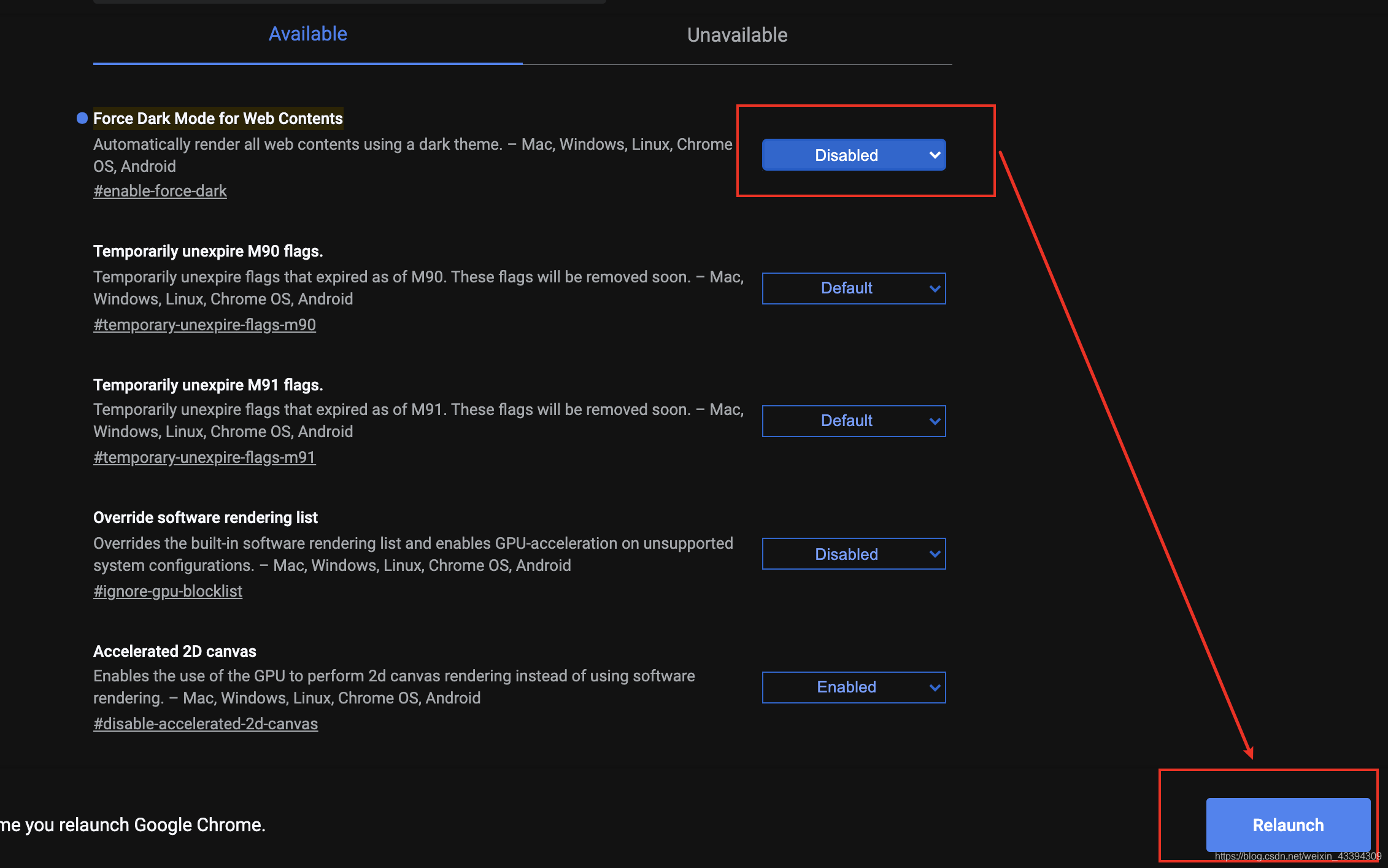 - 将Force Dark Mode for Web Contents栏的Enabled with increase text contrast 更改为Disable