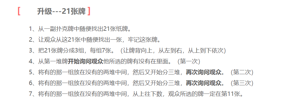 值得一提的是,将21张扑克牌分成3组的具体操作,应该是: