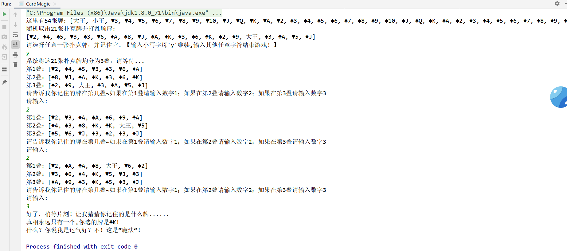 欢迎大佬对代码进行优化,魔术原理请自行百度“21张扑克牌”(本文最后附带表演手法图片)。