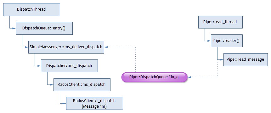 DispatchQueue *in_q; ///接收队列(3)包含一个分发队列DispatchQueue,分发队列有一个专门的分发线程(DispatchThread),将消息分发给Dispatcher(OSD)完成具体逻辑处理。