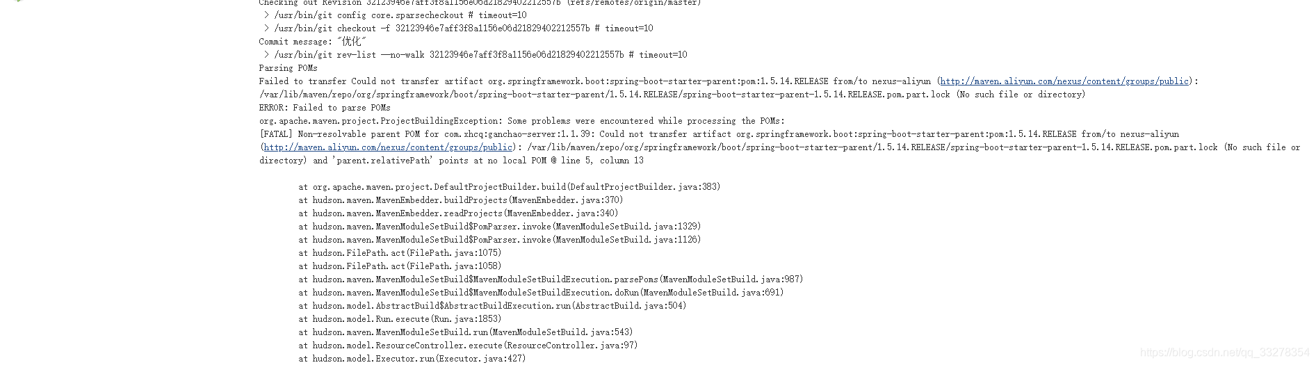 [FATAL] Non-resolvable parent POM for com.xhcq:ganchao-server:1.1.39: Could not transfer artifact org.springframework.boot:spring-boot-starter-parent:pom:1.5.14.RELEASE from/to nexus-aliyun (http://maven.aliyun.com/nexus/content/groups/public): /var/lib/maven/repo/org/springframework/boot/spring-boot-starter-parent/1.5.14.RELEASE/spring-boot-starter-parent-1.5.14.RELEASE.pom.part.lock (No such file or directory) and 'parent.relativePath' points at no local POM @ line 5, column 13
