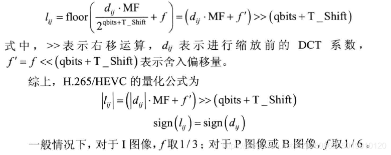其中L表示量化后的值,Qstep 为量化步长,C表示反量化后得到的重构DCT系数。 同样的H.265/HEVC量化过程要同时完成整数DCT中的比例缩放运算。所以最后经过调整的量化公式为: