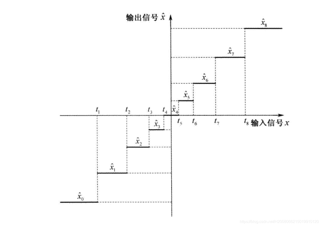 如图:x是输入的信号,落在t7-t8区间的值就用x7表示。实际在编码的时候不一定用的就是x7,有可能是x7对应的一个索引号y7.