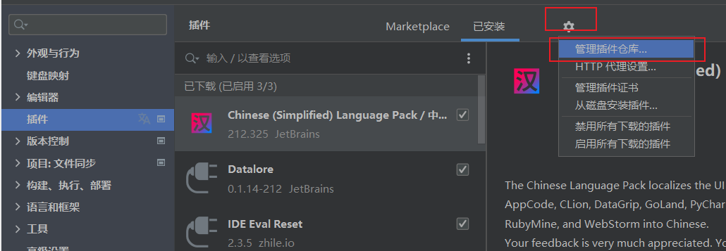 3.打开Settings中的Pulgins,选择Marketplace,搜索chinese