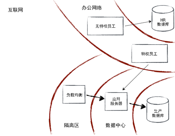 把网络分割成若干安全区域,这种安全架构设计本身就存在问题。设想如下场景:一家小型电子商务公司雇用了几名员工,并拥有若干用来处理薪酬、库存等事务的内部业务系统,还有一些用于运行网站系统的服务器。在这样的场景下,当然需要对访问权限进行分类:员工需要访问内部业务系统;Web服务器需要访问数据库服务器;数据库服务器不需要互联网访问,但员工需要访问互联网等。传统的网络安全架构会把这些访问权限组定义为不同的安全区域,然后规定不同安全区域的访问规则,如图1-7所示。既然这些安全策略是以安全区域为基础定义的,那么不同安全区域之间的网络流量就应当遵循既定的安全策略强制执行检查。
