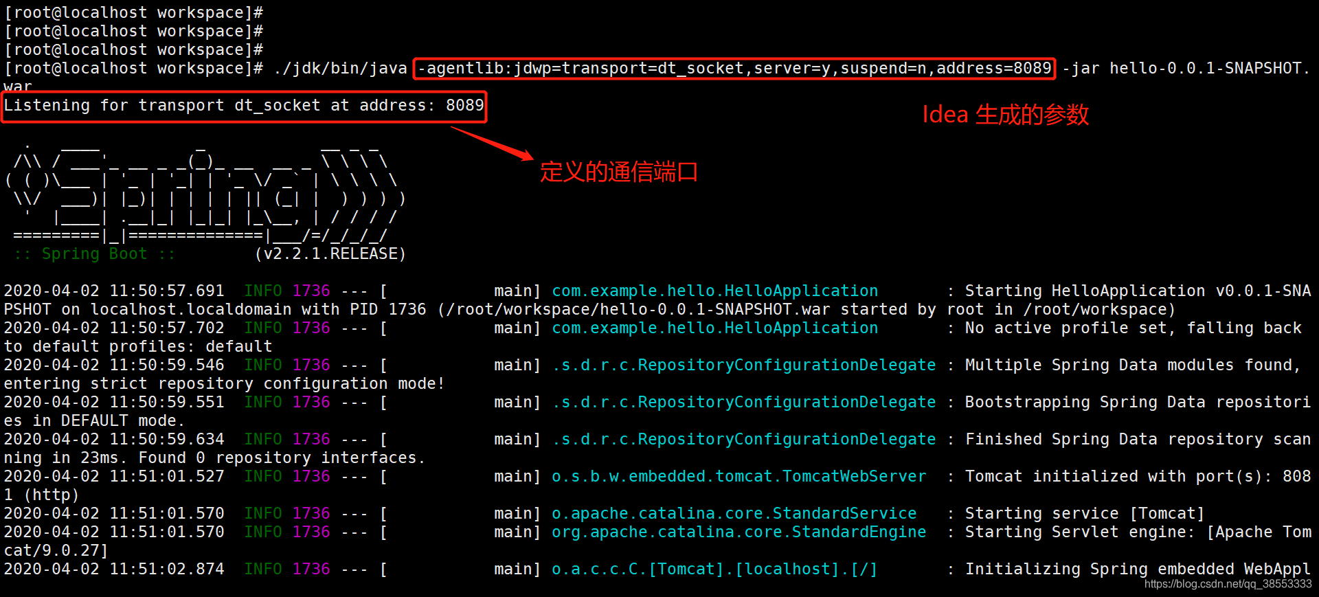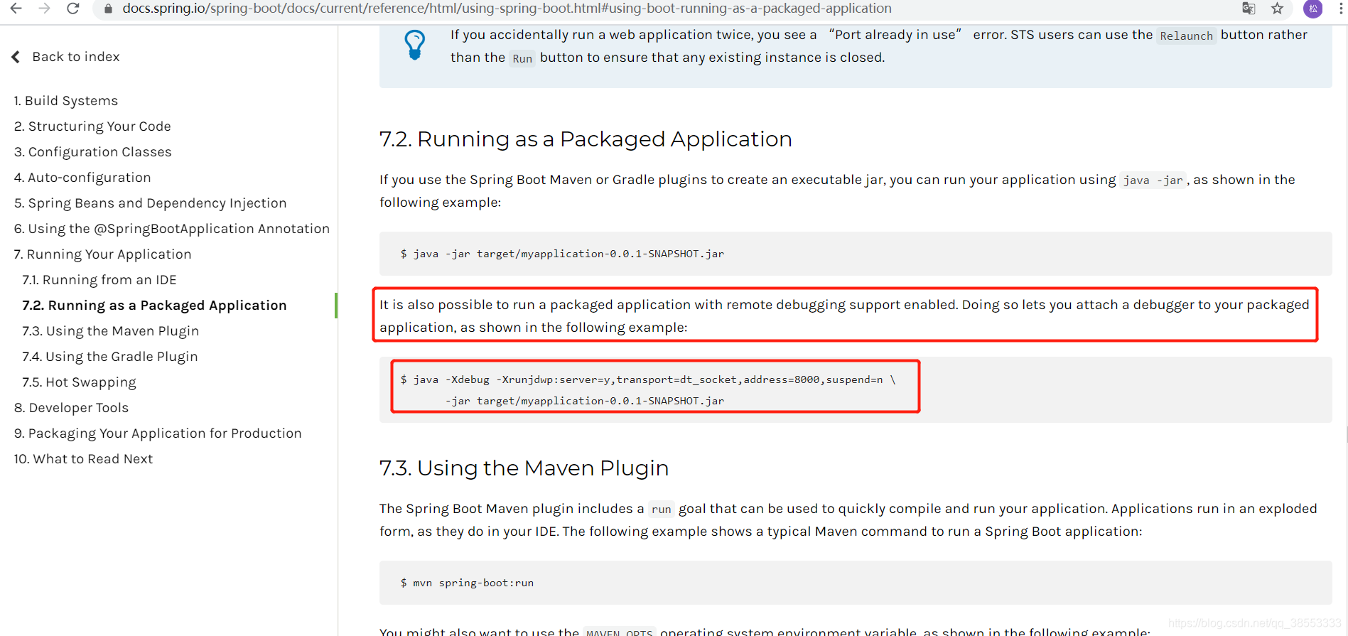 $ java -Xdebug -Xrunjdwp:server=y,transport=dt_socket,address=8000,suspend=n \ -jar target/myapplication-0.0.1-SNAPSHOT.jar