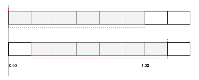 其中每一小个表示 10s,被红色虚线包围的时间段则为需要判断的时间间隔,比如 60s 秒允许 100 次请求,那么红色虚线部分则为 60s。