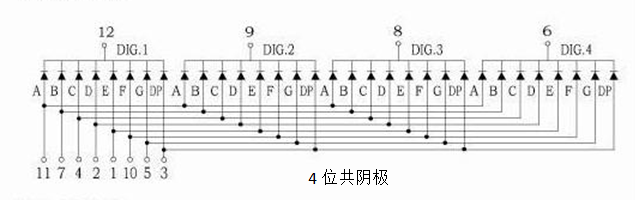 上图是4位数码管的内部接线,每位数码管的阳极(或阴极)相连,其他相同引脚的引脚相连,一共有12个控制引脚,也可以得出8位的数码管有16个控制引脚,8个共阳(或共阴)端,8个控制a~g显示内容。