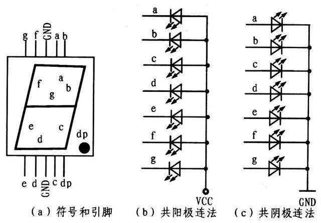 根据内部发光二极管的公共连接端不同,可以分为共阳极接法和共阴极接法,共阳极接法就是发光二极管的正极共同接电源VCC,通过控制每个发光二极管的负极是否接地来显示数字。共阴极接法就是每个发光二极管的负极共同接地GND,通过控制每个发光二极管的正极是否接电源来显示数字。