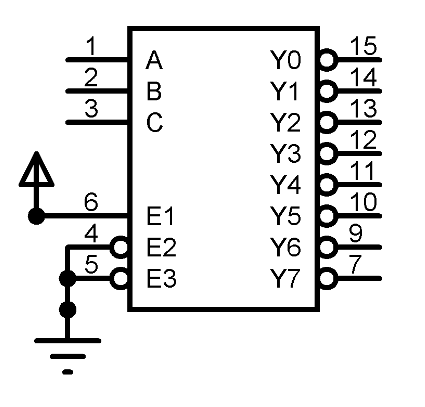 74LS138译码器1~3为输入端,由高到低为CBA; 7~15为输出端,由高到低为Y7-Y0。