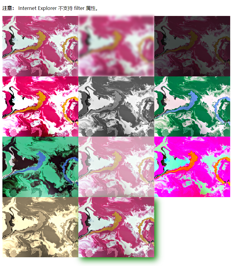 <p><strong>注意:</strong> Internet Explorer 不支持 filter 属性。</p>