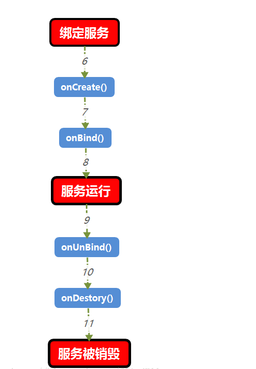 9.某个操作导致服务解除绑定,比如执行了方法unbindService(),那么服务接下来会解除与当前Activity的绑定。接下来服务将面临销毁。