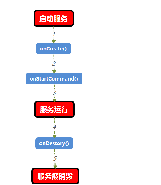 4.某个操作导致服务停止,比如执行了方法stopService(),那么服务接下来会执行onDestory()销毁。服务应该实现此方法来清理所有资源,如线程、注册的侦听器、接收器等。 这是服务接收的最后一个调用。