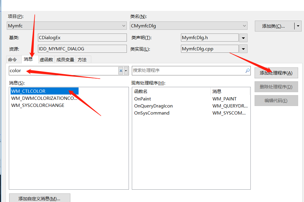 在消息框中输入color,选择添加处理程序
