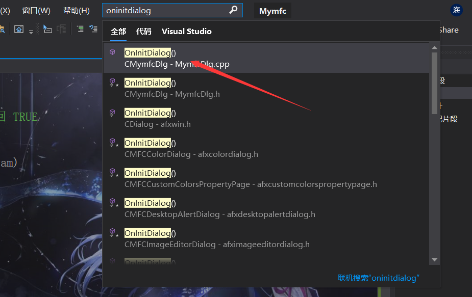 5、在顶部的搜索框中输入oninitdialog,双击跳转到该函数