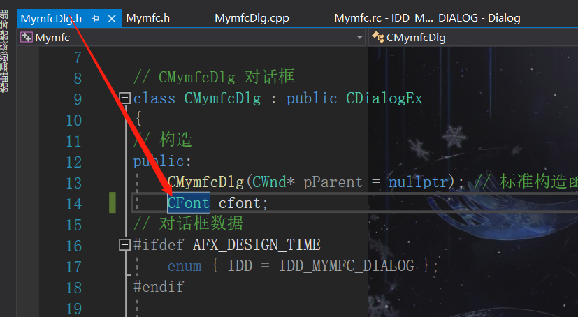 }4、在解决资源方案管理器中找到MymfcDlg.h,在public添加CFont font;