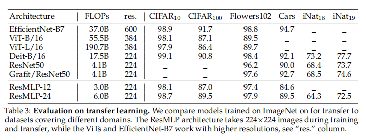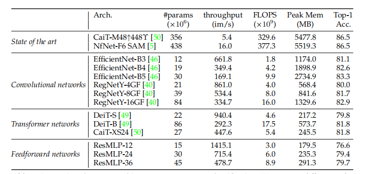 尽管ResMLP在精度、FLOPs以及吞吐量的均衡方面不如ConvNet、Transformer,但其性能仍非常优异;
