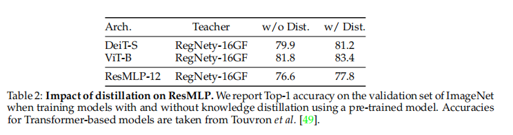 与 DeiT 模型类似,ResMLP 可以从 convnet 蒸馏中显著获益。表中结果表明:前馈网络仍存在过拟合问题。额外的正则技术与蒸馏可以进一步提升模型的性能。