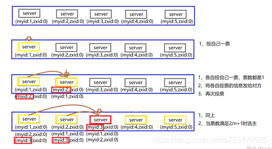 每台服务器都有属于自己的myid与zxid,投票时先比较zxid,如果相同比较myid