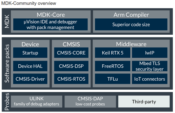 最近,Keil 官方推出了 MDK-Community 版(之前 MDK-Lite 的升级版),该版本有很多国内开发者很在意的特点:免费且没有代码大小限制。这个社区版可供业余爱好者、创客、学生以及学术界人士作为评估使用。MDK-Community 版不限制代码大小并可支持所有非商业应用场景。