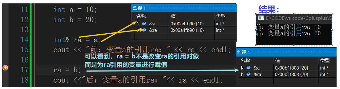 - 引用在初始化时引用了一个实体后,就不能再引用其他实体,而指针可以在任何时候指向任何一个同类型实体;