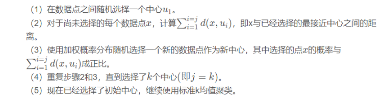 假设已经选取了n个初始聚类中心(0<n<K),则在选取第n+1个聚类中心时:距离当前n个聚类中心越远的点会有更高的概率被选为第n+1个聚类中心。在选取第一个聚类中心(n=1)时同样通过随机的方法。