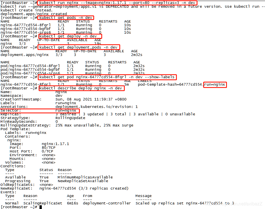 kubectl run nginx --image=nginx:1.17.1 --port=80 --replicas=3 -n dev