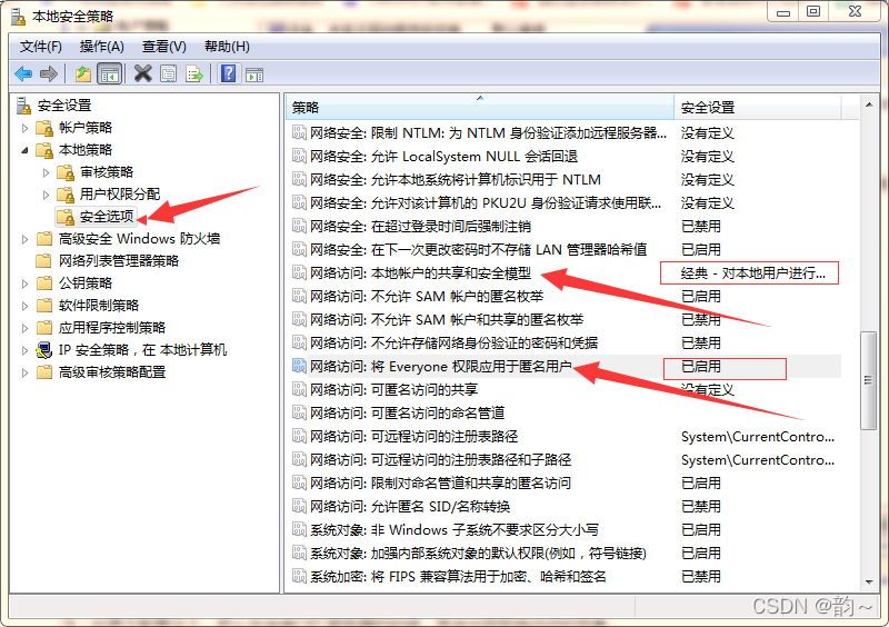 找到 “网络访问:本地账户的共享和安全模型” 右键属性,选择“经典…”,确定;