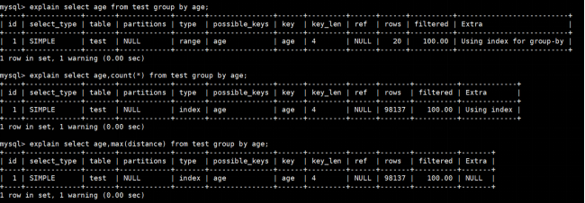 select age,max(distance) from test group by age; 使用索引