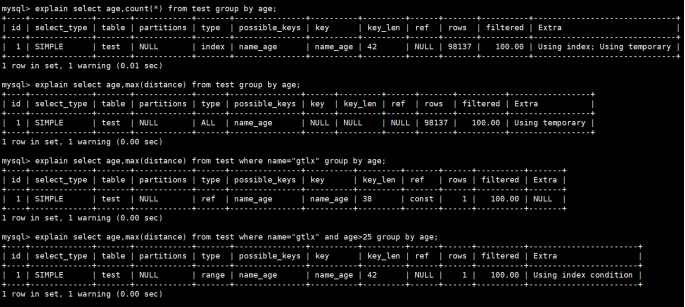 select age,max(distance) from test where name="gtlx" group by age; 使用索引