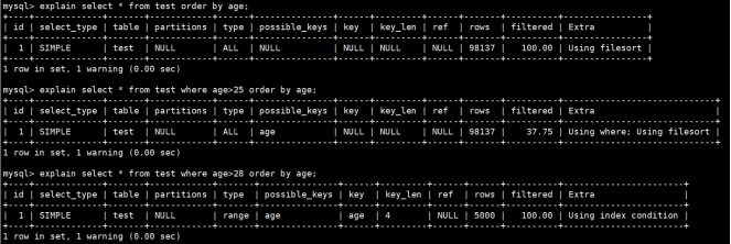 select * from test where age>28 order by age;使用索引