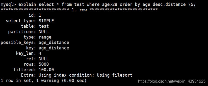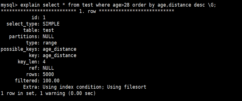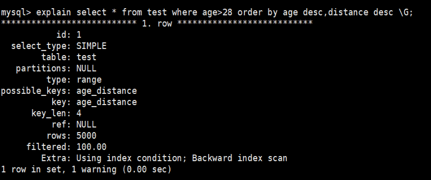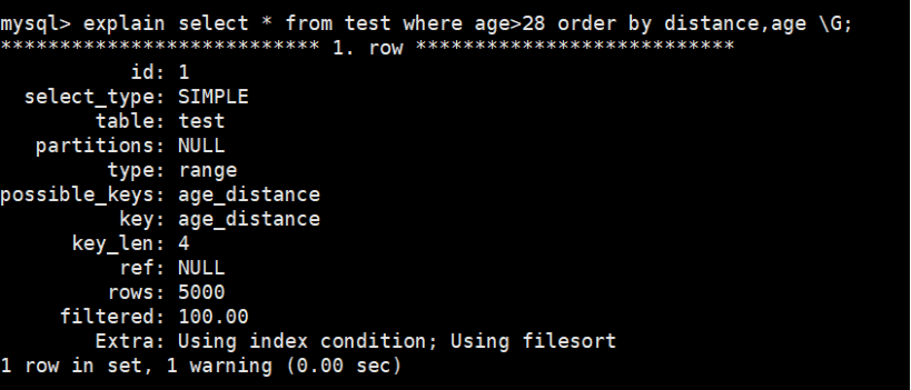 select * from test where age>28 order by age,distance; order by使用索引排序