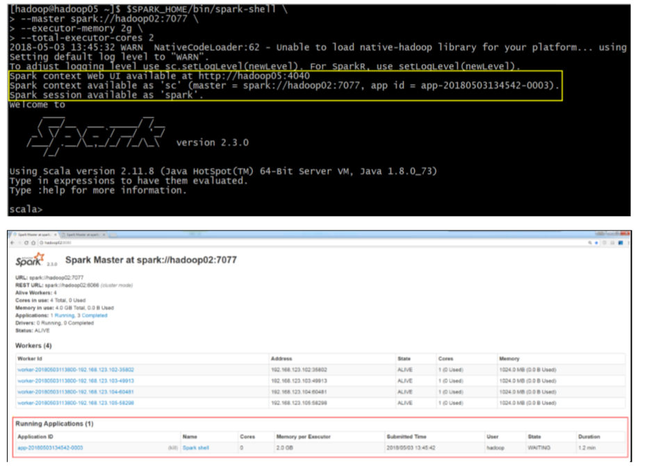 注意上图中的 cores 参数,是 0,那么以后这个 spark shell 中运行的代码是不能执行成功的。 千万注意。必要要把 cpu cores 和 memory 设置合理