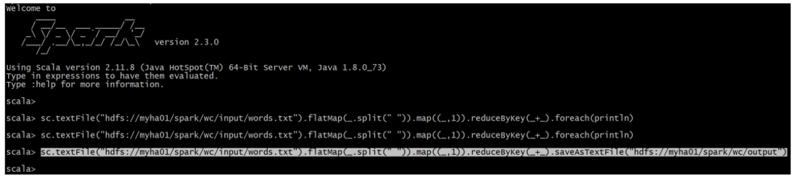 saveAsTextFile("hdfs://myha01/spark/wc/output")将结果写入到 HDFS 对应输出目录中
